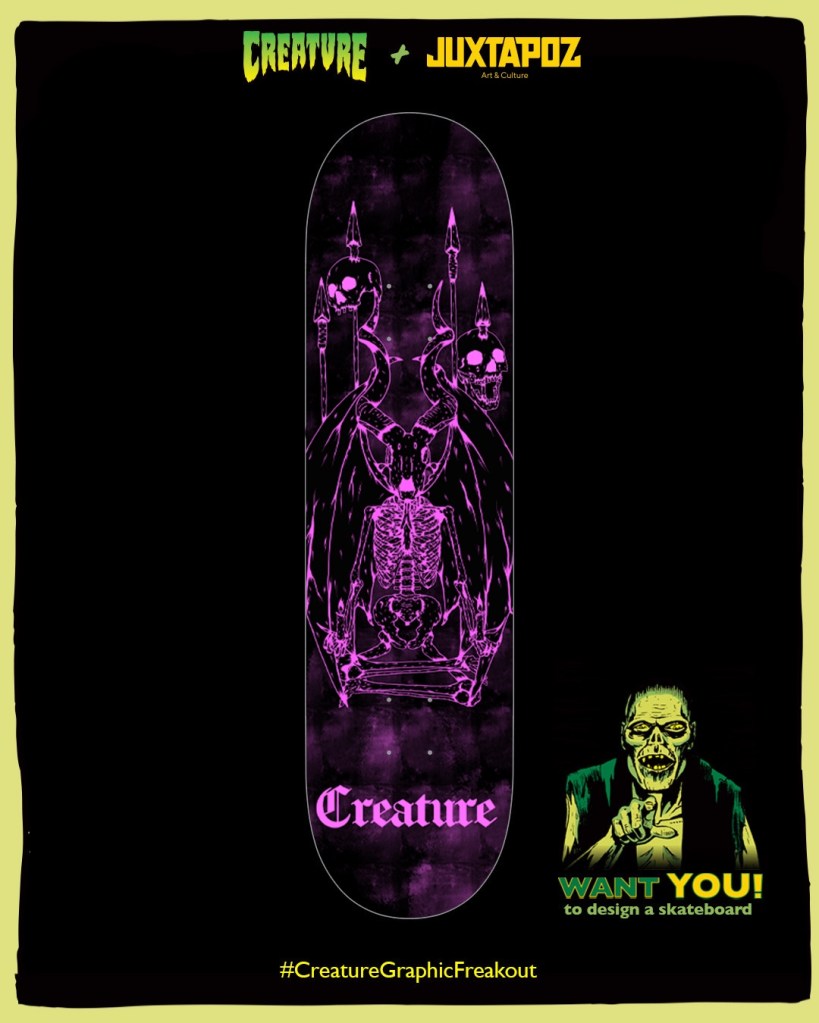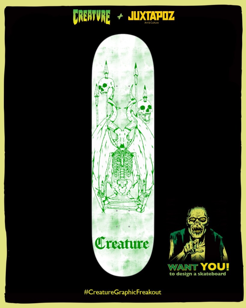 Design entry for Creature Skateboards and Juxtapoz magazine to design Creature skateboards next deck graphic. Nothing came from this but I like the design I came up, which I might take onto some of my own skateboard art.