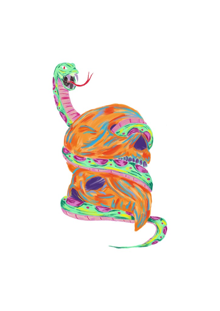 Two skulls with a snake wrapping it’s self around the heads. Dark vibes with bright colours.