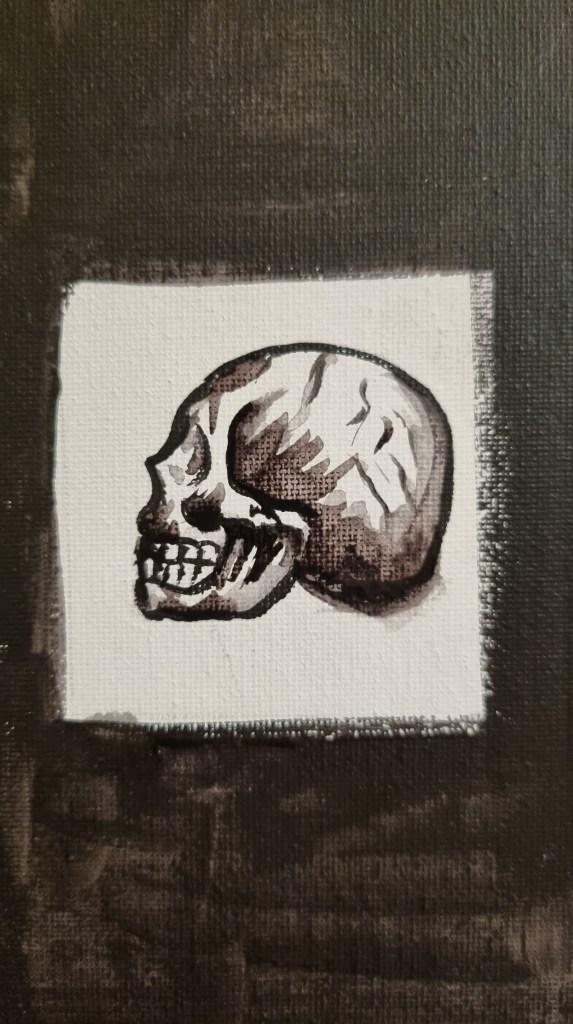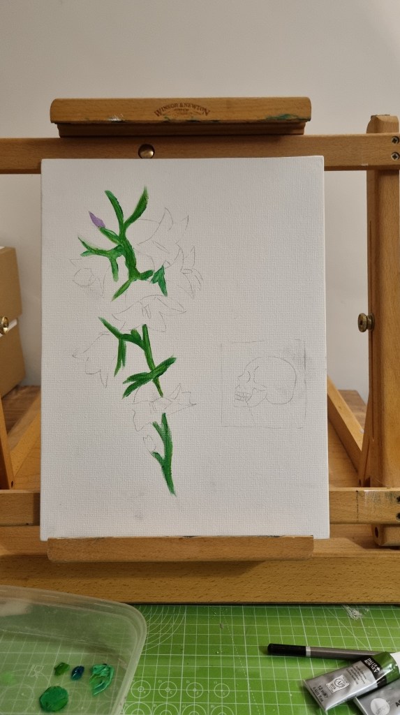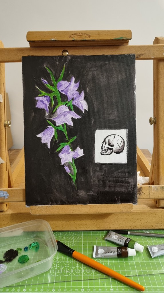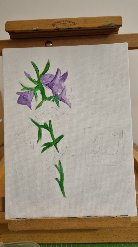 1st layers down on this new bluebell and skull painting. 9x12inch canvas board using acrylic and oil pastels.
