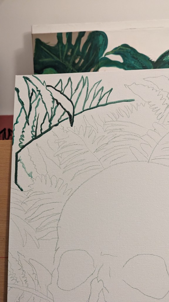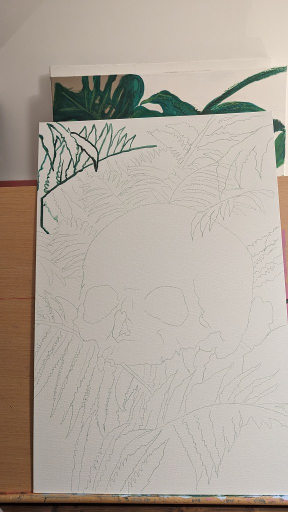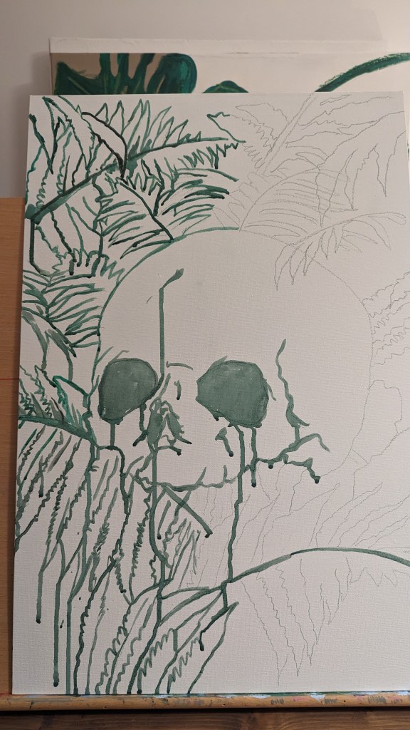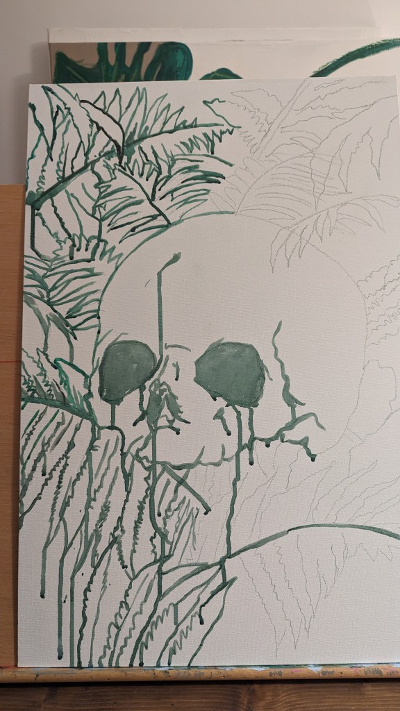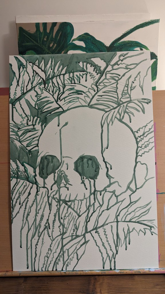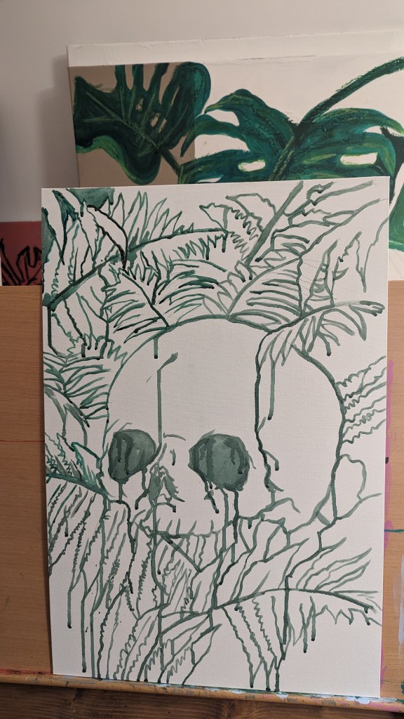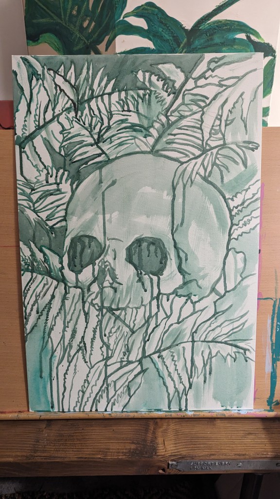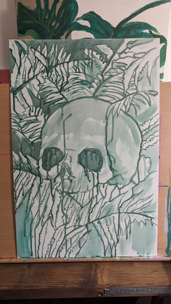 Started a new painting last night. Skull and ferns. Using very lose and watered down water based oil paints to put down the first layers and get some drips and texture to the work. I will then be going back over it with some thicker paint to fill in the details.