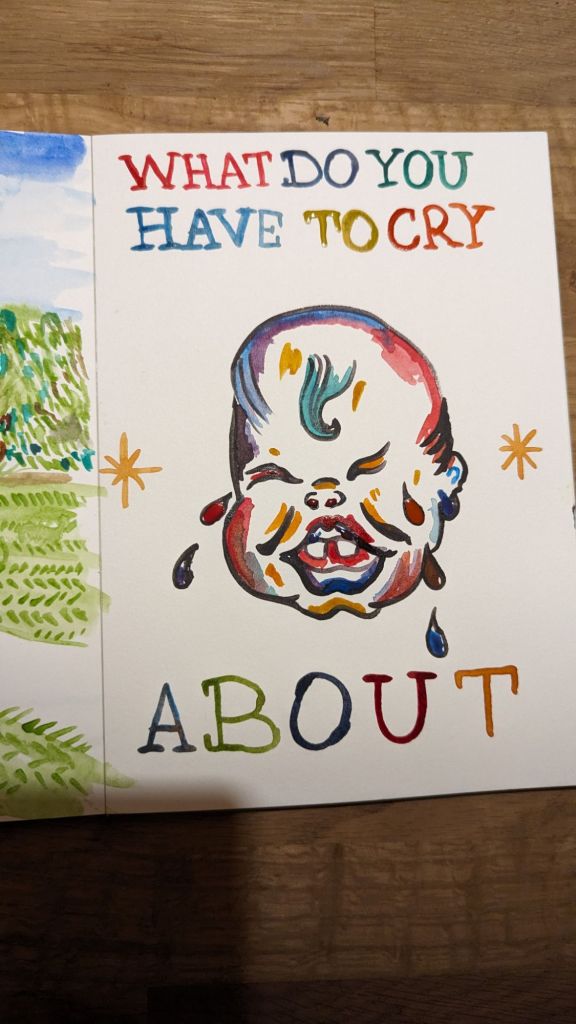 On the right is a traditional crying baby tattoo with some extra colour added in.